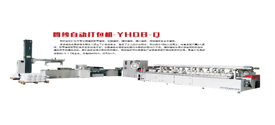 日照裕華機械YHDB-Q筒紗自動打包機系統主要包括配重模塊、包膜模塊、自動上袋模塊、手/自動縫包模塊、捆扎模塊及碼垛等模塊構成,通過該系統很好的實現了對筒紗編織袋的自動打包過程;為適用客戶需求,相繼開發了靜態噴碼機、視覺檢測、快速包膜機、繞膜包裝、立體式單通道配重機及自動上紗機等設備。